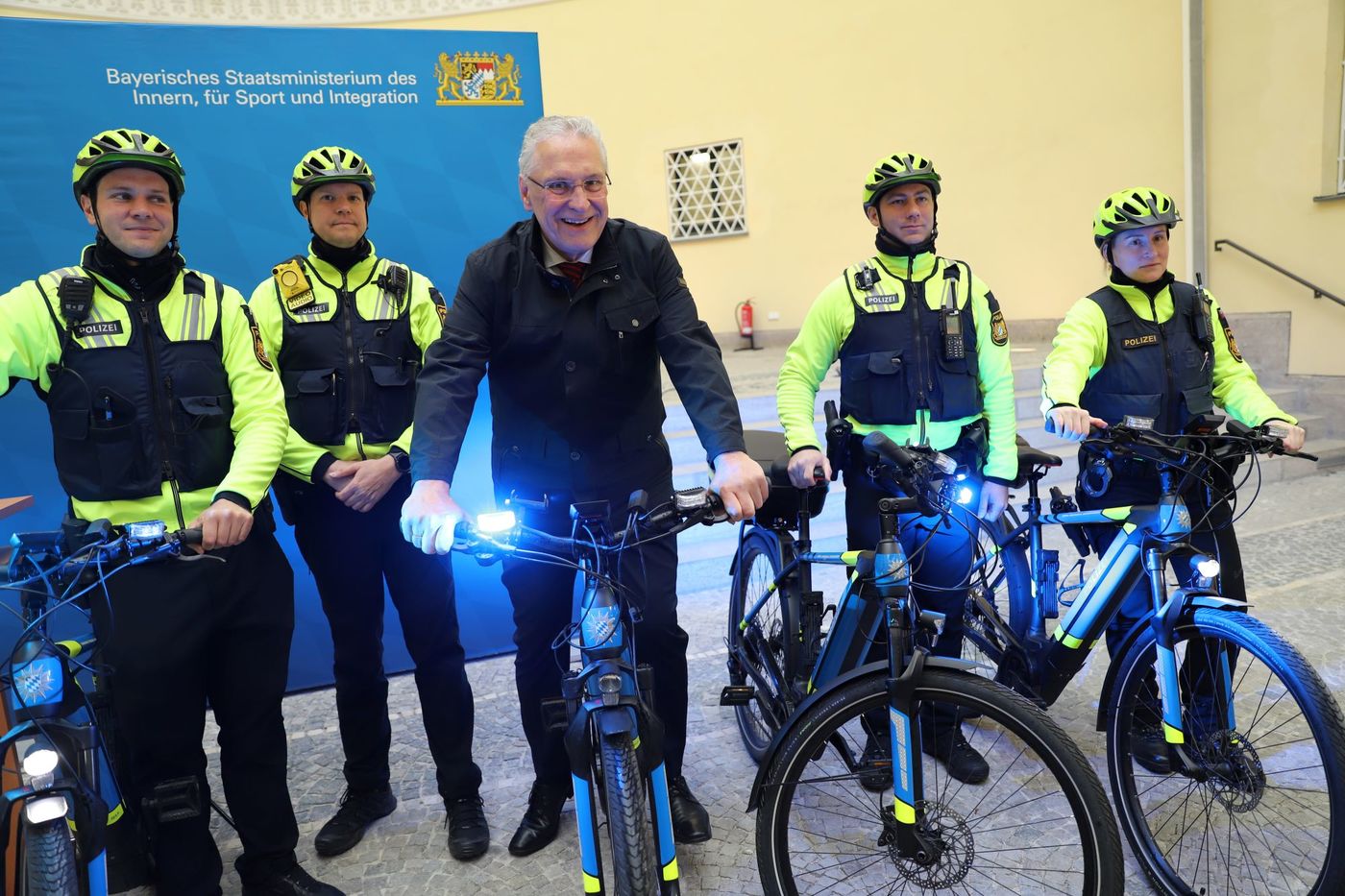Bayerns Innenminister Joachim Herrmann hat heute gemeinsam mit Polizeiradlern die verbesserte Ausrüstung der Fahrradstaffeln vorgestellt. "Unsere Polizei-Fahrradstaffeln in München und Nürnberg sind nunmehr zusätzlich mit Blaulicht ausgestattet. So sind unsere Polizei-Radler im Einsatz noch sichtbarer und können deutlich von anderen Radfahrern unterschieden werden", erklärte der Minister. "Insbesondere bei Dunkelheit sorgen die Front- und Heckleuchten für eine deutliche Erkennbarkeit, etwa beim Absichern einer Gefahrenstelle wie bei Verkehrsunfällen." Dies diene dem Schutz der Polizeikräfte und der anderen Verkehrsteilnehmer. Die bisherigen Erfahrungen des seit einem Jahr laufenden Pilotprojekts seien überaus positiv. "Mit der neuen Schlechtwetter-Bekleidung sind unsere Polizei-Radler auch bei kalten und widrigen Witterungsbedingungen einsatzbereit", ergänzte Herrmann. "Unsere Polizei-Radler sind ein echtes Erfolgsmodell, das wir weiter ausbauen und verbessern werden."