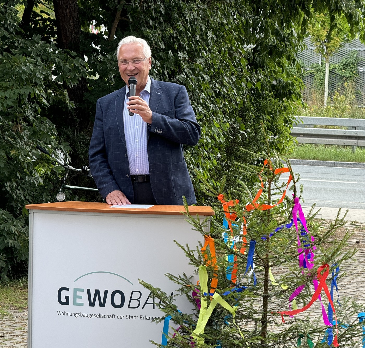 "Dieses Bauprojekt setzt ein klares Zeichen für die Zukunft des Wohnens in Erlangen. Bezahlbarer, nachhaltiger und klimafreundlicher Wohnraum ist nicht nur eine soziale Notwendigkeit, sondern auch ein wesentlicher Bestandteil einer modernen städtischen Infrastruktur." Dies sagte Bayerns Innen- und Kommunalminister Joachim Herrmann beim heutigen Richtfest des Wohnprojekts 'Erlangen-Süd' der Wohnungsbaugesellschaft der Stadt Erlangen (GeWoBau). Mit diesem Pilotprojekt saniert die GeWoBau insgesamt 475 Wohnungen in drei Bauabschnitten energetisch. Zusätzlich entstehen durch Aufstockung in Modulbauweise über 160 neue Wohnungen, überwiegend gefördert mit Mitteln des Freistaats Bayern: "Die bislang beantragten und voraussichtlichen Fördergelder von über 15 Millionen Euro für einen Bauabschnitt sind bestens angelegtes Geld für die Schaffung von nachhaltigem und lebenswertem Wohnraum", betonte Herrmann.