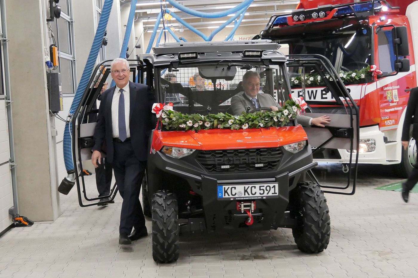 Der Landkreis Kronach hat heute zwei neue Feuerwehrfahrzeuge in Betrieb genommen. Bayerns Innen- und Katastrophenschutzminister Joachim Herrmann übergab die Fahrzeuge und gratulierte vor Ort: "Der neue Gerätewagen Atem- und Strahlenschutz sowie das UTV-Transportgeländefahrzeug werden den Einsatzkräften hier im Landkreis fortan gute Dienste leisten. Wir unterstützen unsere Feuerwehren, wo wir können, daher freue ich mich sehr, dass wir seitens des Freistaats für den Gerätewagen eine Förderung in Höhe von 115.000 Euro leisten und das UTV dem Landkreis sogar kostenlos zur Verfügung stellen konnten." Ein UTV (Utility Task Vehicle) ist ein Nutzfahrzeug für spezielle Aufgaben abseits der Straße in unebenem Gelände. Insgesamt wurden von 2020 bis 2024 mehr als 230 Millionen Euro an Fördergeldern an Gemeinden für die Beschaffung von Feuerwehrfahrzeugen und den Bau von Feuerwehrhäusern ausbezahlt, davon flossen rund 29,5 Millionen Euro nach Oberfranken und rund 3,2 Millionen Euro in den Landkreis Kronach. "Die Sicherheit unserer Bürgerinnen und Bürger ist uns das größte Anliegen, daher geben wir unser Bestes, um die Rahmenbedingungen unserer Feuerwehren optimal zu gestalten", so Herrmann.