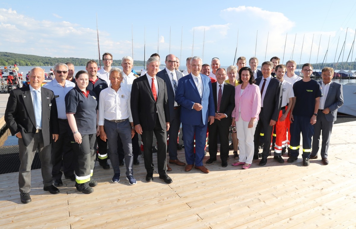 Beeindruckt zeigte sich Herrmann von der vorangegangenen Seenotrettungsübung der Wasserwacht, der DLRG, des BRK und der Wasserschutzpolizei. Die erfolgreichen Sportlerinnen und Sportler des Bayerischen Yacht-Clubs waren mit ihren Segelbooten unter Leitung des Clubvorsitzenden Dr. Michael Steiner maßgeblich am Übungsablauf beteiligt. "Das war hervorragende Arbeit. Man kann zwar nur hoffen, nicht eines Tages selber in eine Notlage zu geraten. Aber falls doch, ist man ob zu Lande oder zu Wasser bei den bayerischen Rettungsorganisationen, den Feuerwehren, dem THW und der Polizei eindeutig in den besten Händen", lobte der Minister und weiter: "Es hat deutlich gezeigt, was für ein gut aufgestelltes Gefahrenabwehr- und Hilfeleistungssystem wir in Bayern haben."